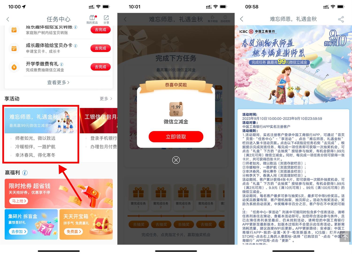 工行APP搜索“任务中心”->难忘师恩 礼遇金秋->简单浏览得5次机会抽1.99~99元微信立减金