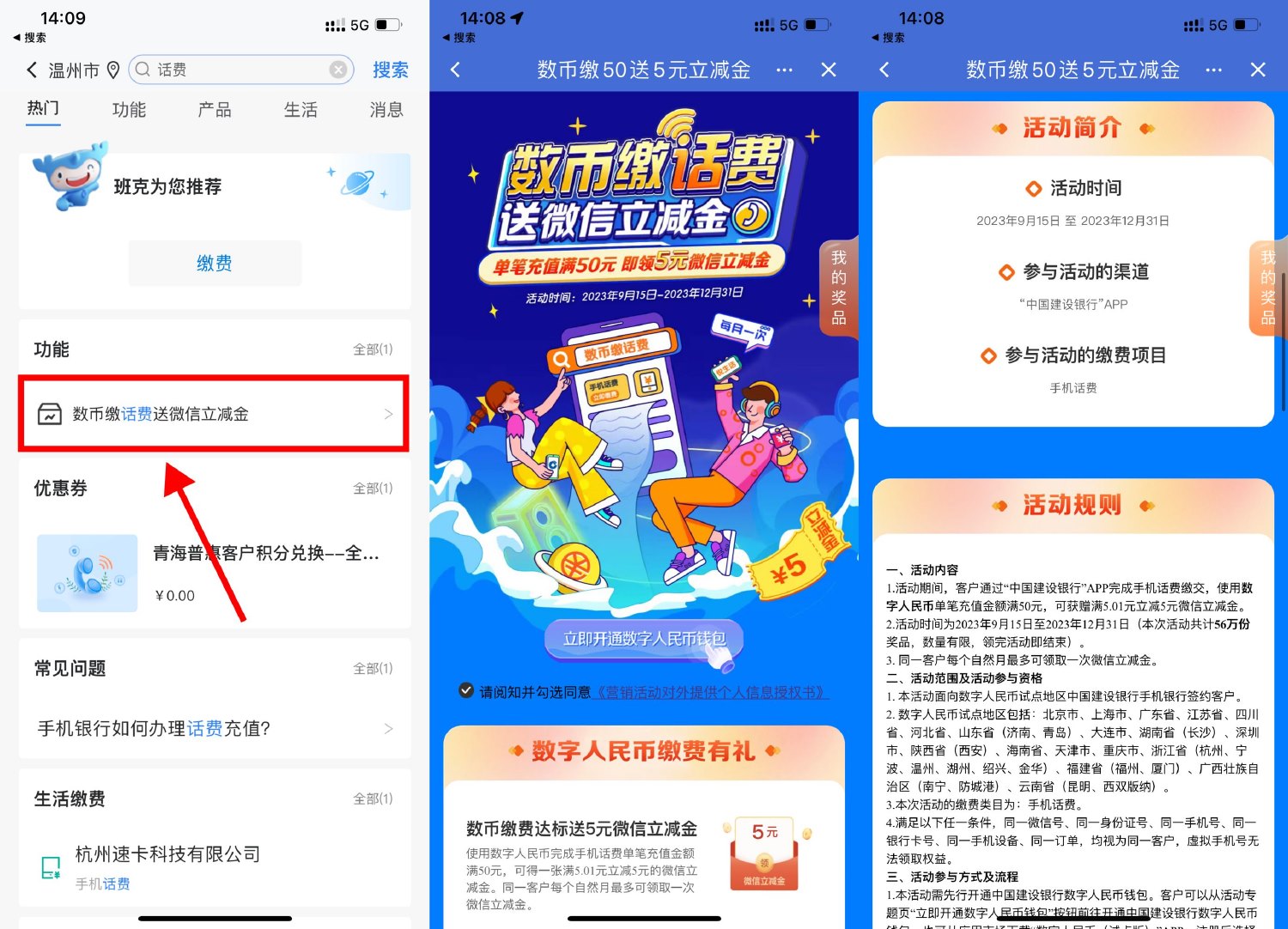 建行APP搜索“话费”->根据规则使用数币钱包支付,充50元话费赠送5元立减金,刚好要冲的可以看看