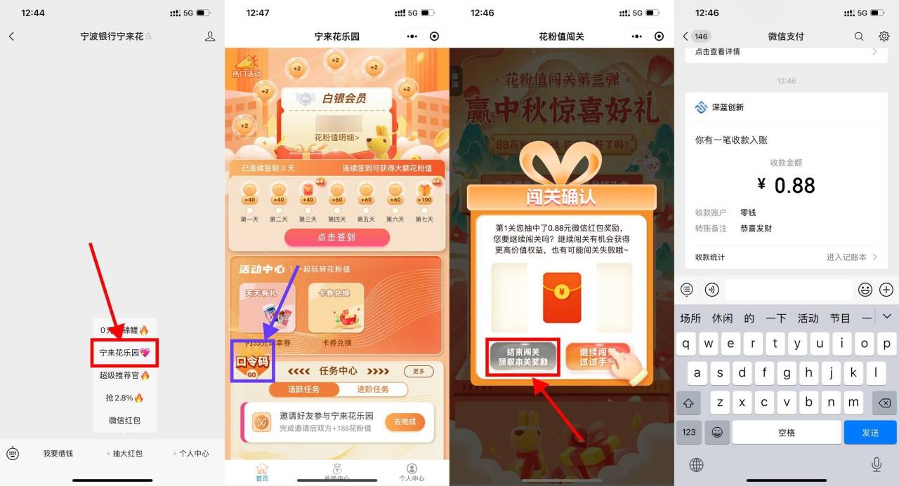 1、微信关注公众号“宁波银行宁来花”->菜单栏“宁来花乐园”->输入口令码“948289236137152512”得188花粉