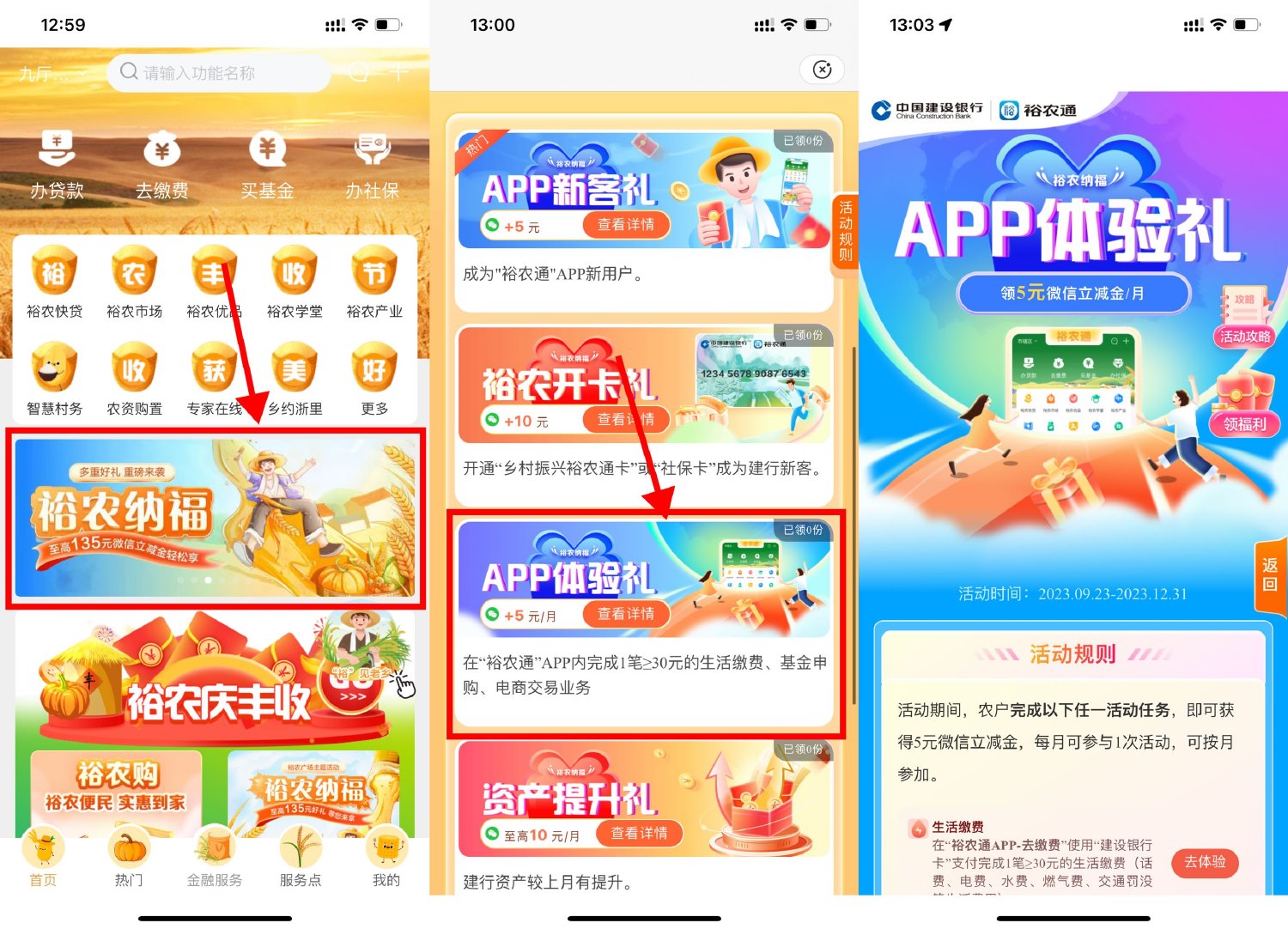 1、应用商店下载“裕农通”APP->轮播图“裕农纳福”->APP体验礼