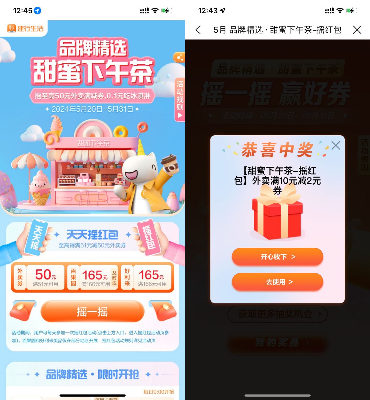 打开地址跳转到建行生活APP->简单摇一摇抽外卖满减券等奖励