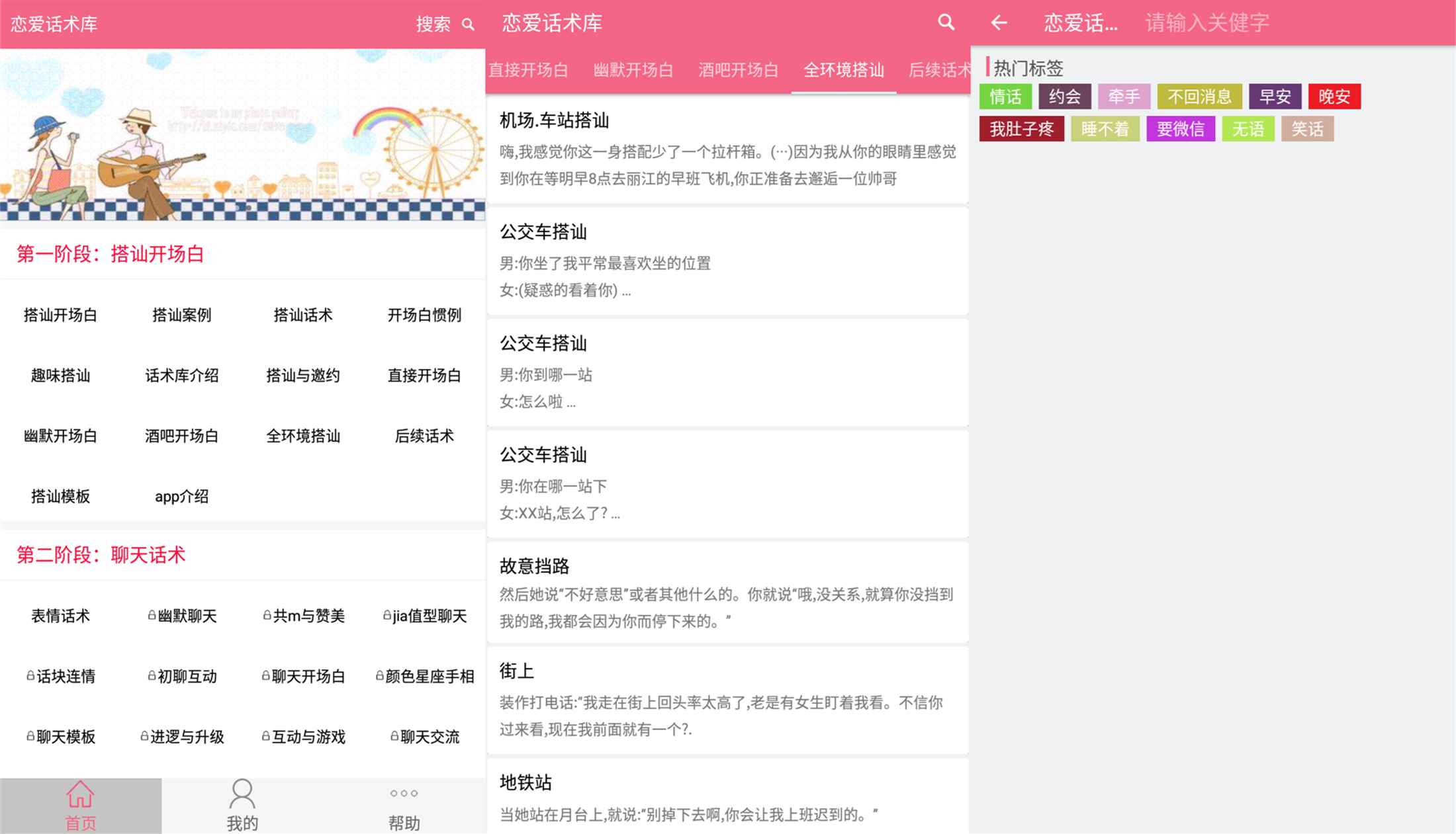 恋爱话术库是一款教你撩妹密语软件。和女生聊天没有话题? 不知道怎么逗乐女生? 不知道女生对你有没有意思? 恋爱话术4W+话术库,N+精彩回复供您选择,让您和女生聊天不再烦恼,已解锁功能。