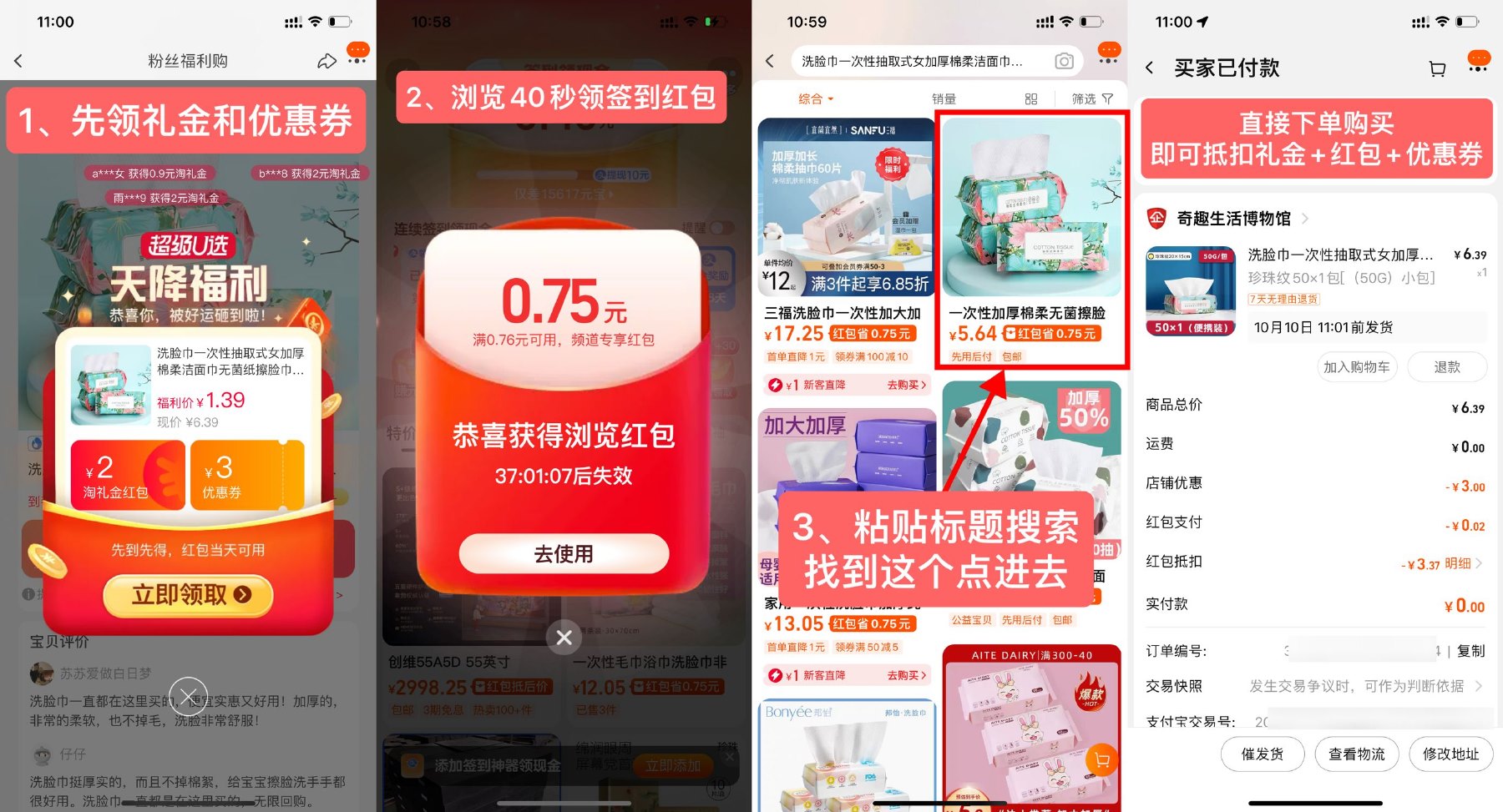 趣奇资源网本次为大家分享的是淘宝最低0元撸洗脸巾50抽