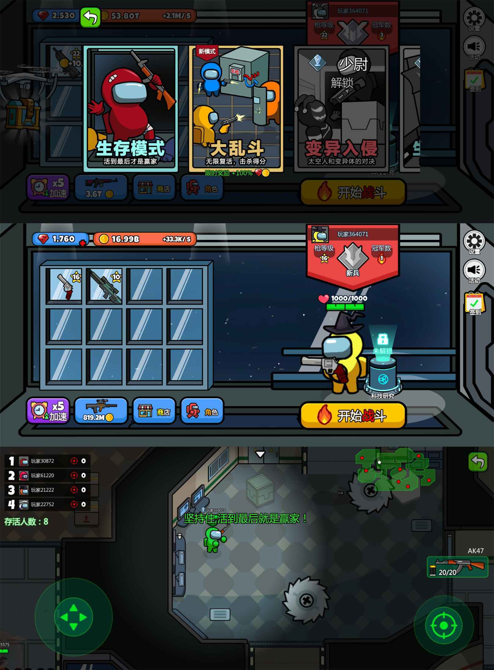太空大逃杀是一款娱乐称射击游戏。多样的游戏模式,近百种武器,合成建造更高等级的武器,在不同模式中厮杀到最后,取得最后的胜利。(免广告得奖励)
